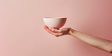 Female hands hold empty ceramic bowl pink blue background. Top view