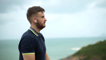Handsome young sports man standing on the beach listening music with earphones.