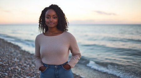 Young woman standing on a pebble beach at sunset with calm waves in the background