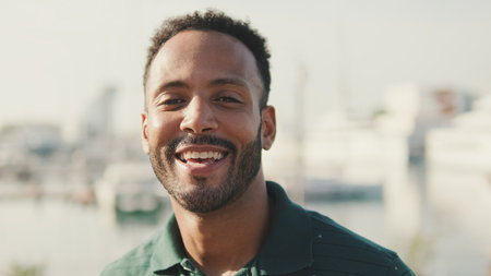 Handsome and confident, outdoor smiling portrait of relaxing young african egyptian man traveler on the beach.