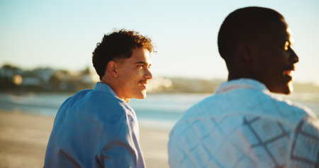 Happy, beach and men with vacation, thinking and bonding together with tourism, relax and break. Outdoor, friends and traveller with ocean, smile and coastline with seaside, summer holiday or nature
