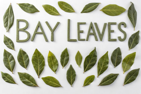 \Word \\BAY LEAVES\\ with laurel leaves on white background\