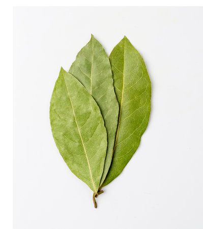 A single bay leaf showcases its rich green hue, resting on a smooth, light surface. This herb is often used in culinary preparations for flavor enhancement.