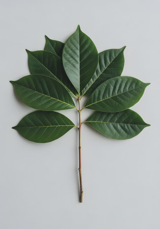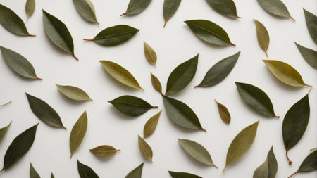 A visually appealing arrangement of fresh green leaves spread out on a clean white background, creating a harmonious and natural pattern.