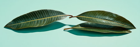 Rich green leaves are displayed in a close-up view, highlighting their smooth texture and vibrant colors under soft lighting, creating an inviting and serene atmosphere.