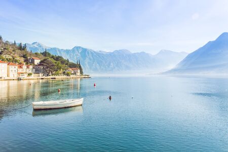 Landscape view of the Bay of Kotor on the background of mountains and sky