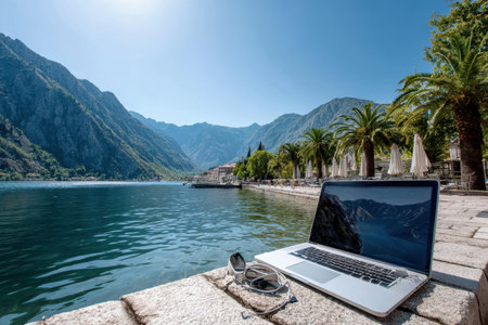 A laptop rests on a stone surface by the water, surrounded by palm trees and mountains on a sunny day.