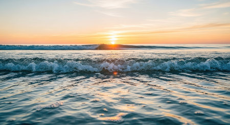 A stunning view of tranquil ocean waves reflecting a golden sunset, creating a serene atmosphere. The beautiful scenery captures the beauty of nature and peace.