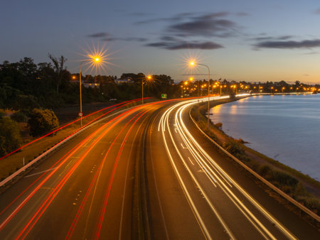 Southwards along Tauranga Takitimu Expressway long exposure in dark of night with lights of vehicles streaming highlighting red and yellow light streams movement of cars passing along road dark sky and above