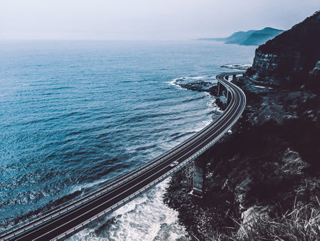 Aerial view of bridge along cliff edge and ocean with traffic. Sea Cliff Bridge view on sunrise. Illawarra, New South Wales, Australia