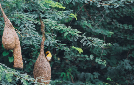 Image of female baya weaver nesting on nature background. Bird. Animals.