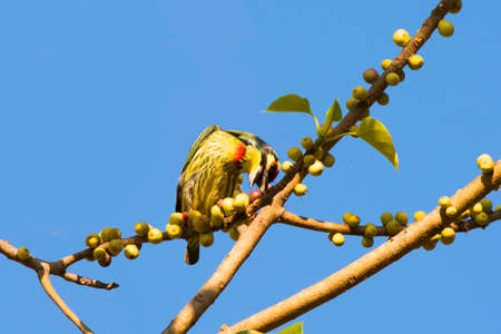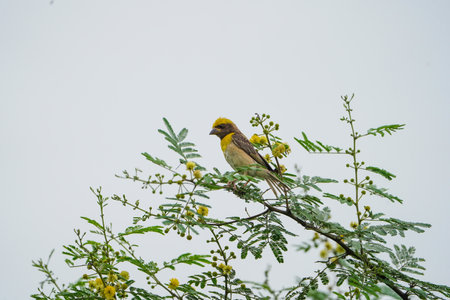 Baya Weaver sitting on a branch blue sky background - The baya weaver (Ploceus philippinus) is a weaverbird found across the Indian Subcontinent and Southeast Flocks, Golden sparrow Baya weaver