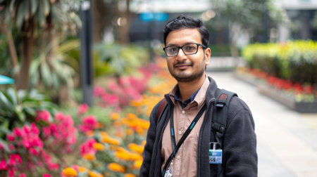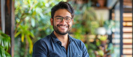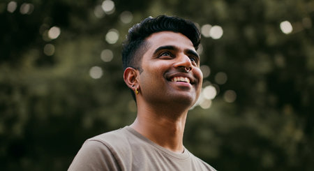 A cheerful young male poses confidently in a serene outdoor setting, showcasing his infectious smile while framed by vibrant green foliage and a weathered wall.