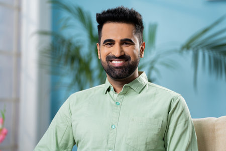 Happy smiling indian man looking camera while sitting on sofa at home - concept of confident, Joyful expression and positive emotion.