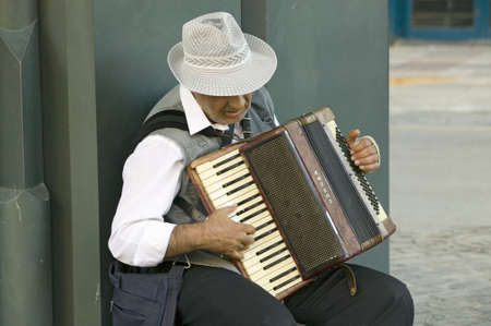 Street performer playing music on a vintage accordion squeeze box