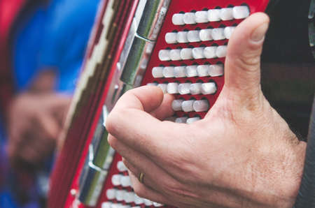 Hand detail of elderly person playing chromatic accordion at a folk festival
