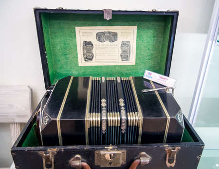 Tula, Russia - January 3, 2021: Bandoneon full-bar, accordion museum of grandfather Filimon, Tula