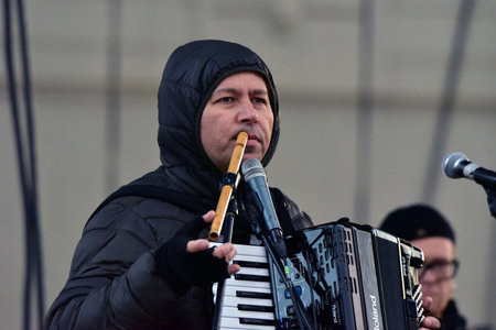 Yelabuga, Russia, March 14, 2021: street harmonica player surrounded by women.