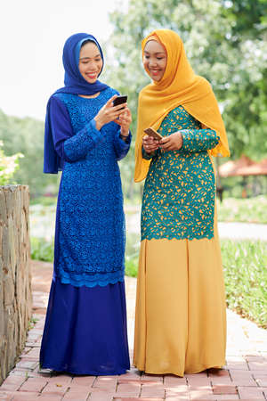Two beautiful smiling Muslim women with smartphones standing outdoors in colorful traditional dresses