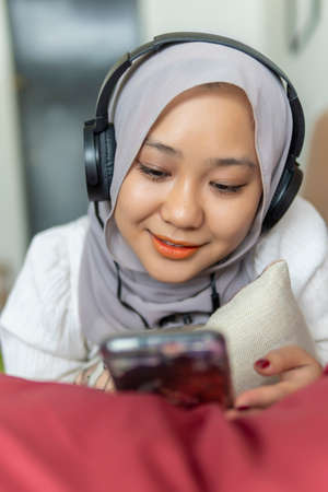 Lifestyle at home, cute malay woman at the sofa reading books and listening to the music