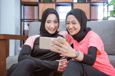 two women wearing hijab sportswear smiling while taking selfies together with a cellphone while sitting on the floor in the house