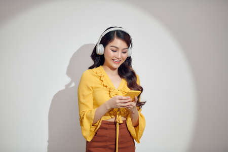 Cheerful woman listening to music with headphones isolated over white background, holding mobile phone