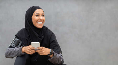 Athletic muslim woman in modest sportswear relaxing with smartphone after training outdoors