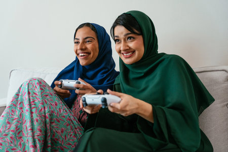 Cheerful emirate women in hijabs sitting on a cozy sofa, enjoying a friendly video game competition in a modern living room, blending tradition with contemporary entertainment