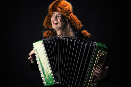 attractive emotional woman in fur hat playing the accordion