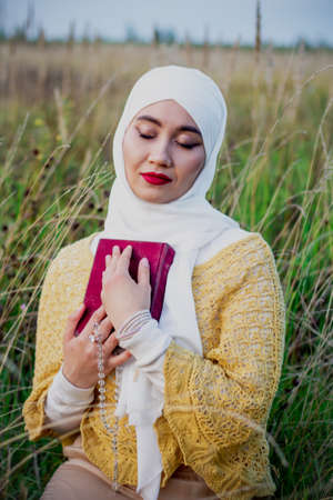 A Muslim woman in a field holds the Holy Koran book in her hands. Muslim rosary. Muslim woman in beige hijab. Beauty, femininity, tenderness.