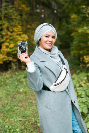 Young Arab Woman wearing hijab headscarf photographing with a smartphone in park. Modern muslim girl