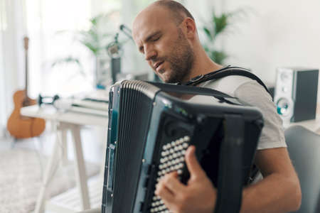 Musician in his studio at home, he is playing the accordion, arts and creativity concept