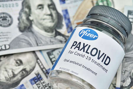 Tashkent, Uzbekistan - November 9, 2021: US dollars and Paxlovid oral drug against Covid-19. Pfizer selling novel coronavirus oral pills. Concept of purchasing, buying or roll out Paxlovid tablet