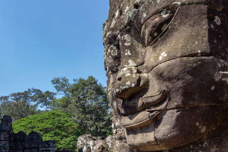 Closeup stone face of prasat Bayon temple, Angkor Thom Cambodia