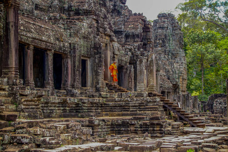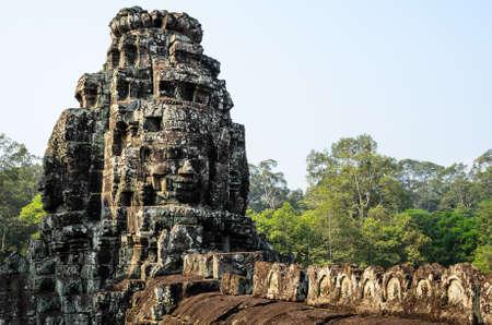 Mysterious ruins of ancient Bayon temple in Angkor Thom. Amazing Angkor Thom nestled among rainforest in Siem Reap, Cambodia. Enigmatic Angkor Thom is a popular tourist attraction.