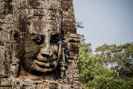 Ancient stone smiling face of the Bayon Wat temple in the jungle, Angkor wat, Cambodia. Angkor Wat isthe largest religious monument in the world.