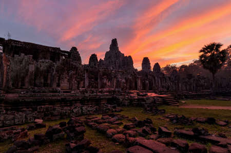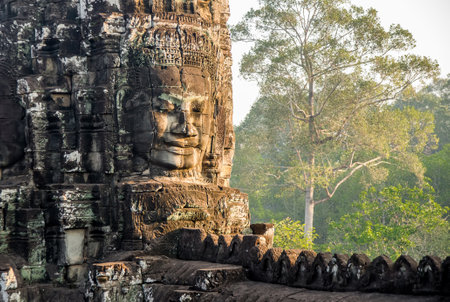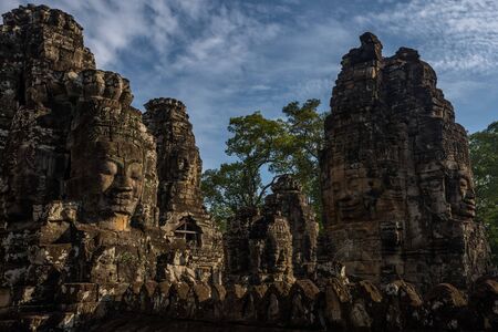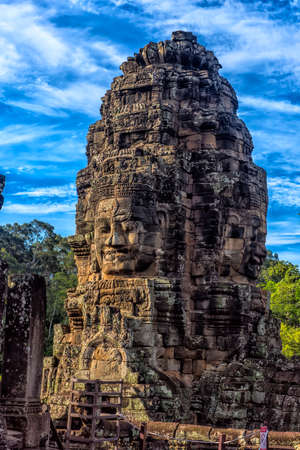 Amazing view of mysterious giant smiling stone face of ancient Bayon temple at sunset, Angkor Thom, Siem Reap, Cambodia. Angkor Thom is a popular tourist attraction of Asia.