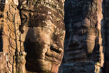 Stone faces in Bayon, Angkor Thom temple, selective focus sunset light. Buddhism meditation concept, world famous travel destination, Cambodia tourism.