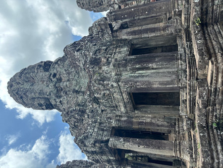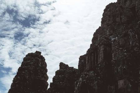 Bottom view of the ruins at Ankgor Thom, Cambodia under a cloudy sky - UNESCO World Heritage Site 1992