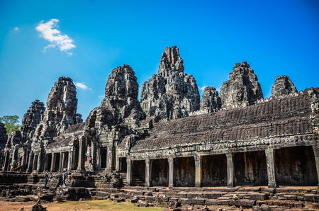 Bayon temple with cloud, blue sky and tourist in Angkor wat Angkor thom area, Siem reap of Cambodia. Prasat Bayon most smiling stone faces on the many towers.