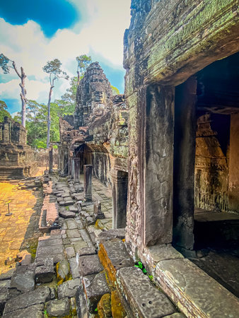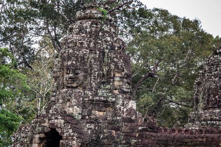 Mysterious ruins of ancient Bayon temple in Angkor Thom. Amazing Angkor Thom nestled among rainforest in Siem Reap, Cambodia. Enigmatic Angkor Thom is a popular tourist attraction.