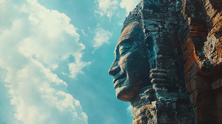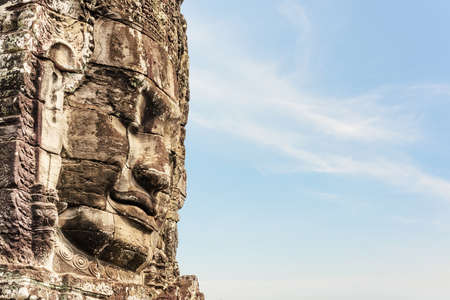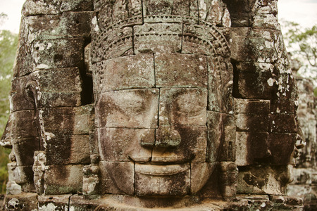 Smiling stone face of Prasat Bayon, the central temple of Angkor Thom Complex, Siem Reap, Cambodia. Ancient Khmer temple is surrounded by tropical trees, famous Cambodian landmark