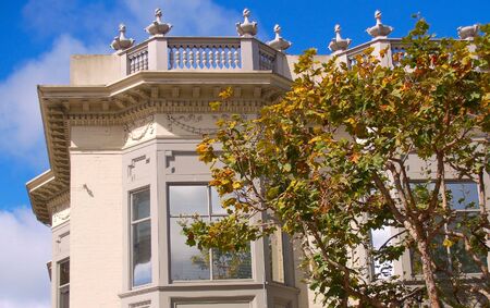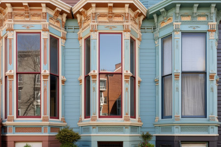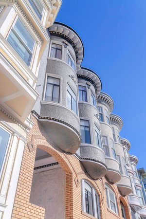 Traditional San Francisco, California Victorian style bay windows. Low angle view.