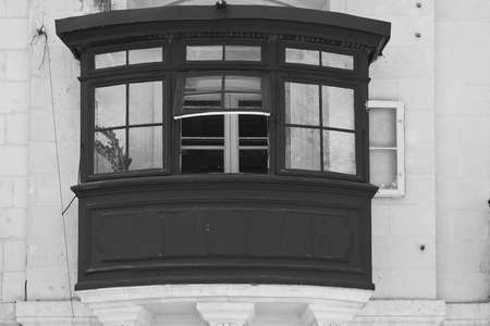 Building with traditional colorful maltese balcony in historical part of Valletta. Black and white picture