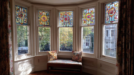 Bright and inviting Victorian window featuring colorful stained glass panels, enhancing the cozy atmosphere of a charming interior setting.
