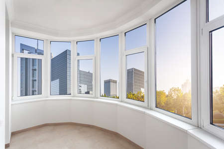 epmty minimalistic interior background, balcony of modern apartment with panoramic windows