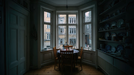 Dimly lit, cozy dining area in a vintage-style home, featuring a wooden table and chairs placed within a bay window. Shelves filled with antique-looking dishes add to the charm of the room.