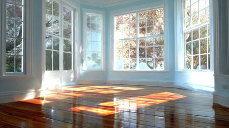 An empty room bathed in sunlight features multiple windows and a hardwood floor. The composition highlights architectural details with a neutral color palette. This image may be suitable for various commercial or editorial uses, showcasing interior design and space.