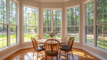 Bright and cozy breakfast nook featuring large windows offering beautiful outdoor views, ideal for enjoying family meals, morning coffee, or peaceful moments.