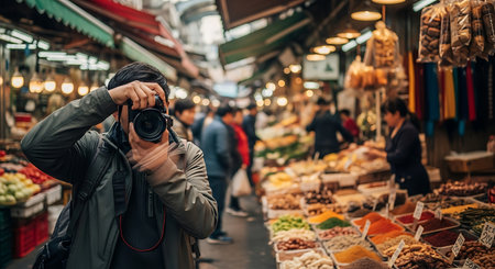 tourist wandering through a bustling market, surrounded by vibrant colors and unique offerings, created with generative ai